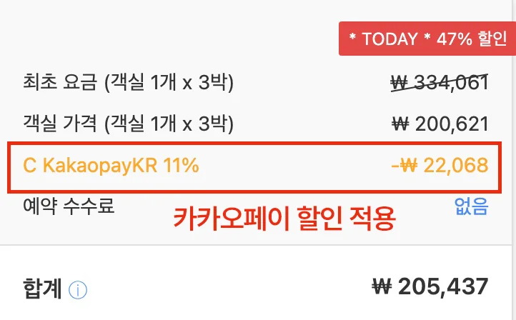 카카오페이 결제시 국내/해외 숙소가 11% 할인되며 기간은 7월 한 달간 진행됩니다. 할인 이벤트는 전용프로모션 페이지에서 선불결제가 완료된 건에서만 할인이 적용되니 결제할 때에는 카카오페이 선불결제로 진행하시면 됩니다.