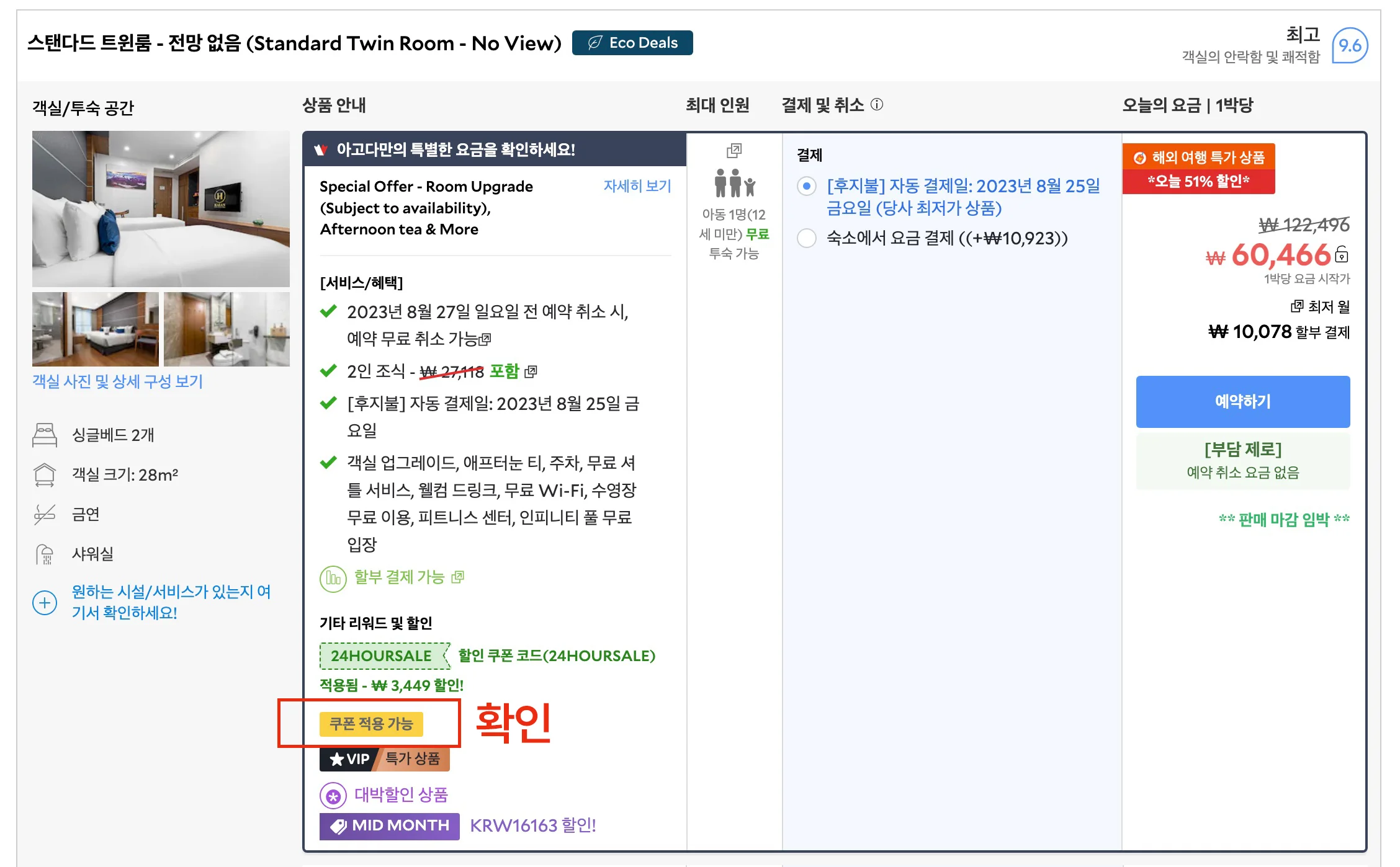 위의 조건들이 있어야만 할인이 적용 되기 때문에 상품안내 부분(아래사진 참고)에서 확인 후 예약을 진행하면 됩니다. 만약 할인이 되는지 안되는지 헷갈린다면 예약하기 버튼을 누른후 오른쪽의 결제금액 부분에서 할인 적용 유무를 확인할 수가 있습니다. 저도 헷갈리때는 이렇게 확인해보고 예약을 하는 편입니다.