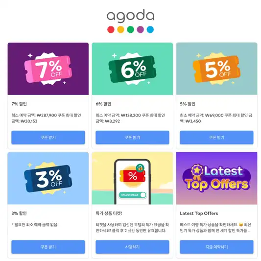 아고다 할인코드의 종류는 기본적으로 7%, 6%, 5%, 3% 할인 쿠폰이 대표적이며 특가상품 티켓이나 베스트 여행 특가 상품까지 종류가 다양합니다.